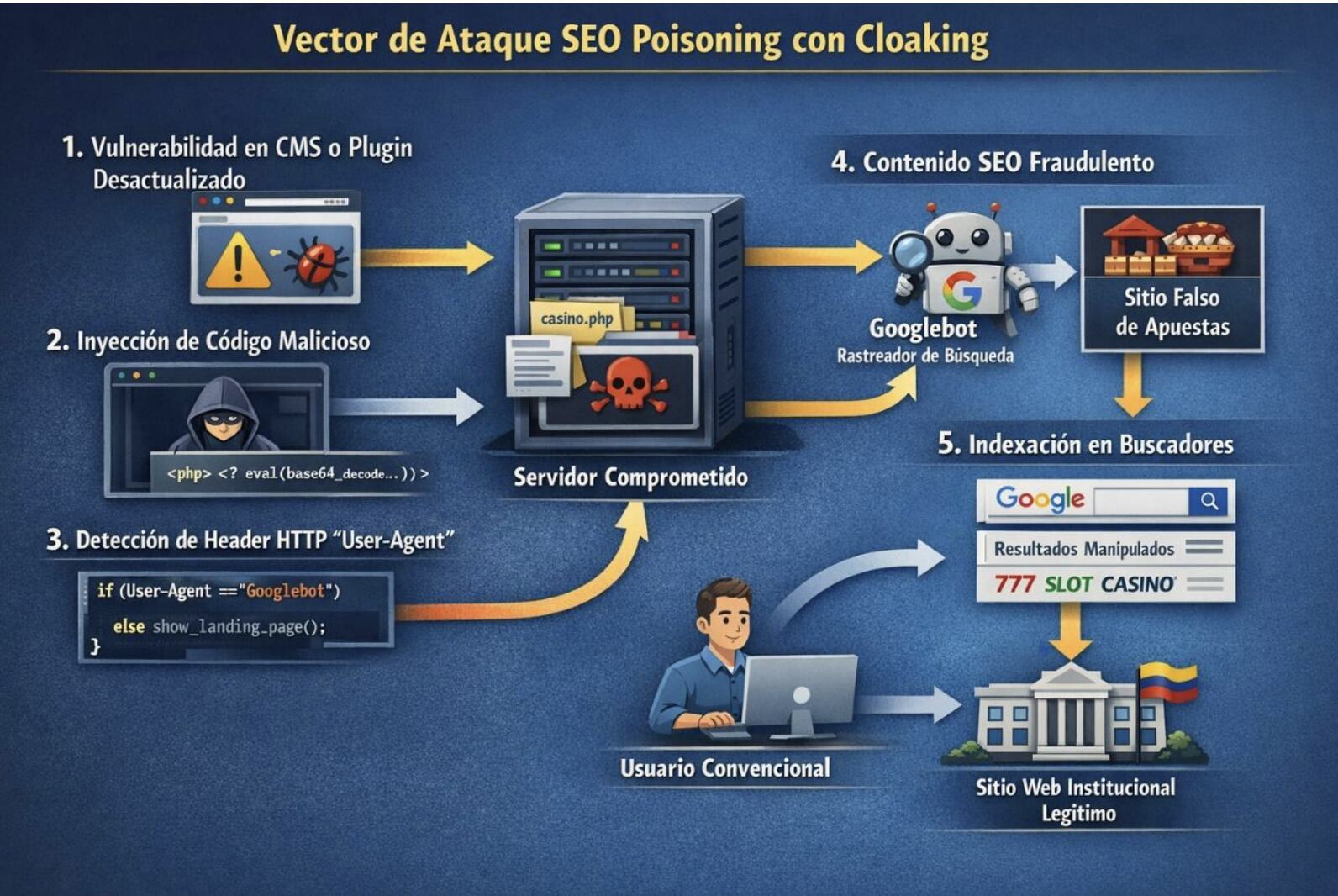 El Grupo de Respuesta a Emergencias Cibernéticas de Colombia (Colcert) emitió una alerta técnica tras identificar una campaña activa de manipulación de motores de búsqueda que afecta a sitios web institucionales bajo el dominio .gov.co. El ataque utiliza una técnica avanzada denominada cloaking (encubrimiento), la cual permite a los atacantes aprovechar la reputación digital de las entidades públicas para promocionar sitios de apuestas ilegales y casinos tailandeses sin que el personal administrativo o la ciudadanía lo perciban a simple vista.