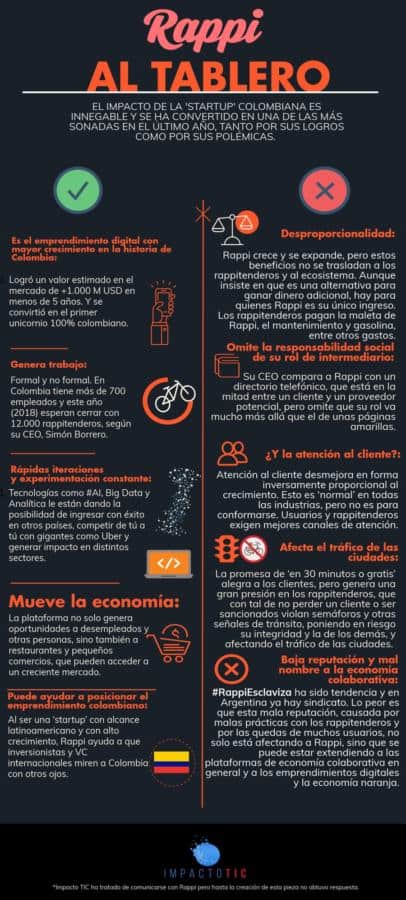 Mientras analizamos en detalle el ‘caso Rappi’, en próximos contenidos, hacemos una breve mirada de lo bueno y lo malo de la plataforma creada por Sebastián Mejía, Simón Borrero y Felipe Villamarín. ¿Qué puntos clave le agregarían a cada columna? Compartan sus ideas en Twitter o Facebook con el hashtag #ImpactoRappi, para que pasemos de la crítica –o la palmadita en la espalda– a la propuesta.