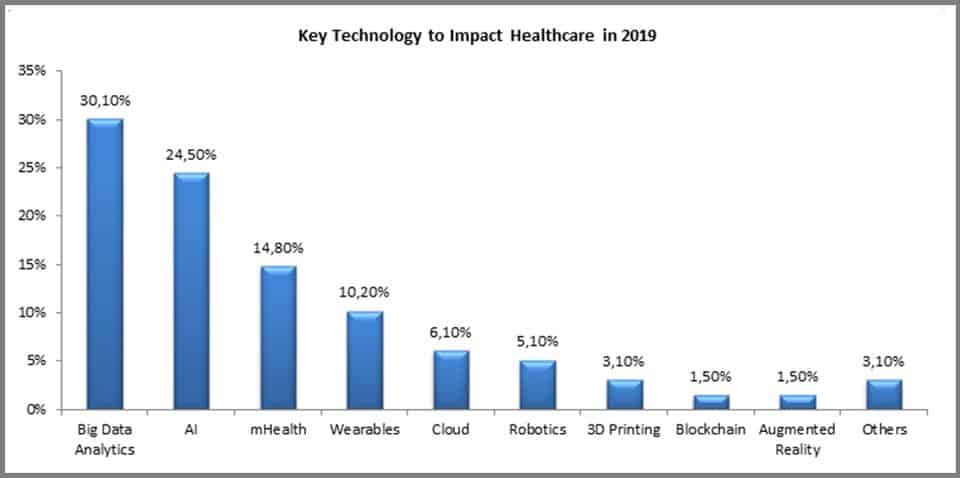 Según una encuesta de la revista Forbes en la que les pidieron a los líderes empresariales que indicaran cuál tecnología tendría el impacto más profundo en salud durante 2019, estos fueron los resultados: