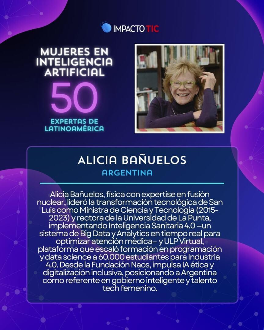Alicia Bañuelos, física con expertise en fusión nuclear, lideró la transformación tecnológica de San Luis como Ministra de Ciencia y Tecnología (2015-2023) y rectora de la Universidad de La Punta, implementando Inteligencia Sanitaria 4.0 —un sistema de big data y analytics en tiempo real para optimizar atención médica— y ULP Virtual, plataforma que escaló formación en programación y data science a 60.000 estudiantes para Industria 4.0. Desde la Fundación Naos, impulsa IA ética y digitalización inclusiva, posicionando a Argentina como referente en gobierno inteligente y talento tech femenino.