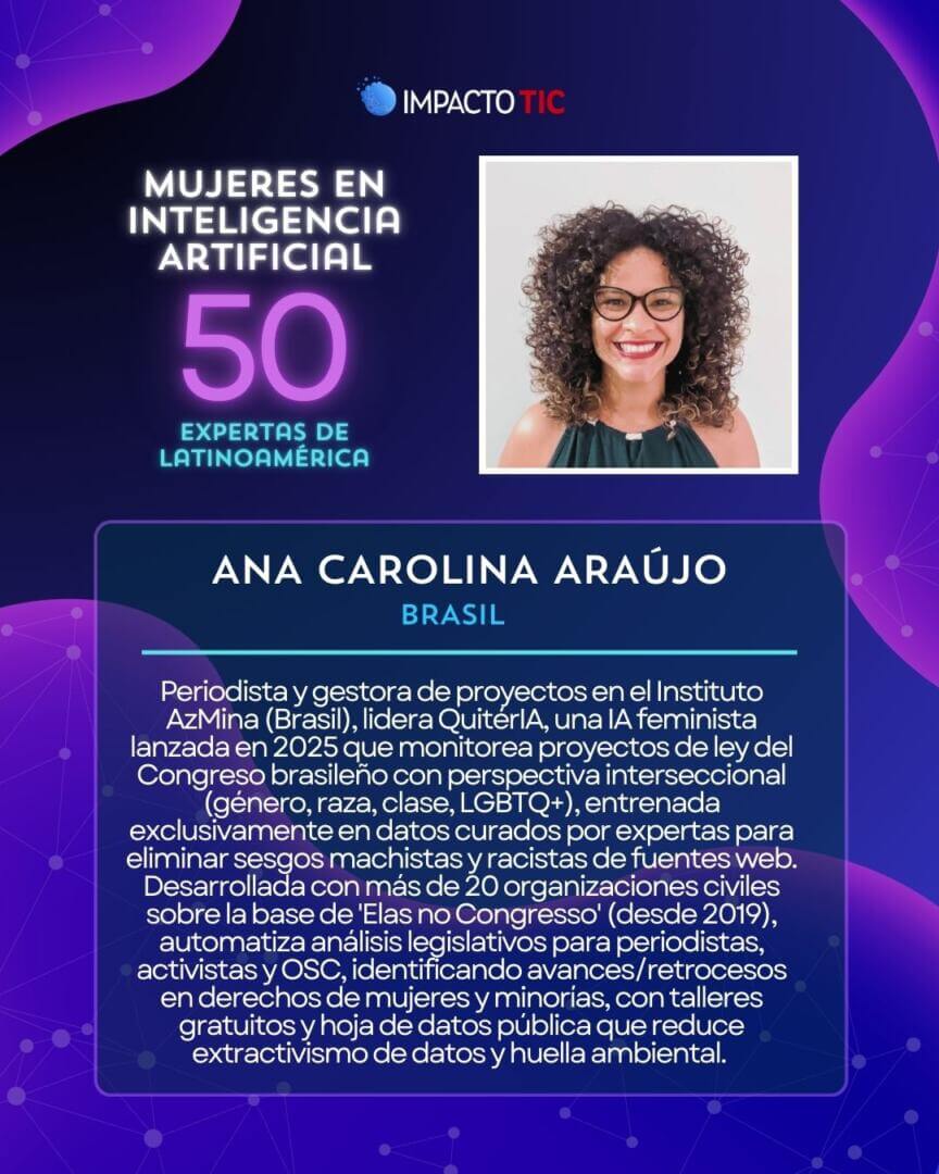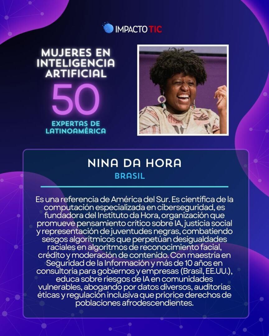 Es una referencia de América del Sur. Es científica de la computación especializada en ciberseguridad, es fundadora del Instituto da Hora, organización que promueve pensamiento crítico sobre IA, justicia social y representación de juventudes negras, combatiendo sesgos algorítmicos que perpetúan desigualdades raciales en algoritmos de reconocimiento facial, crédito y moderación de contenido. Con maestría en Seguridad de la Información y más de 10 años en consultoría para gobiernos y empresas (Brasil, EE.UU.), educa sobre riesgos de IA en comunidades vulnerables, abogando por datos diversos, auditorías éticas y regulación inclusiva que priorice derechos de poblaciones afrodescendientes.