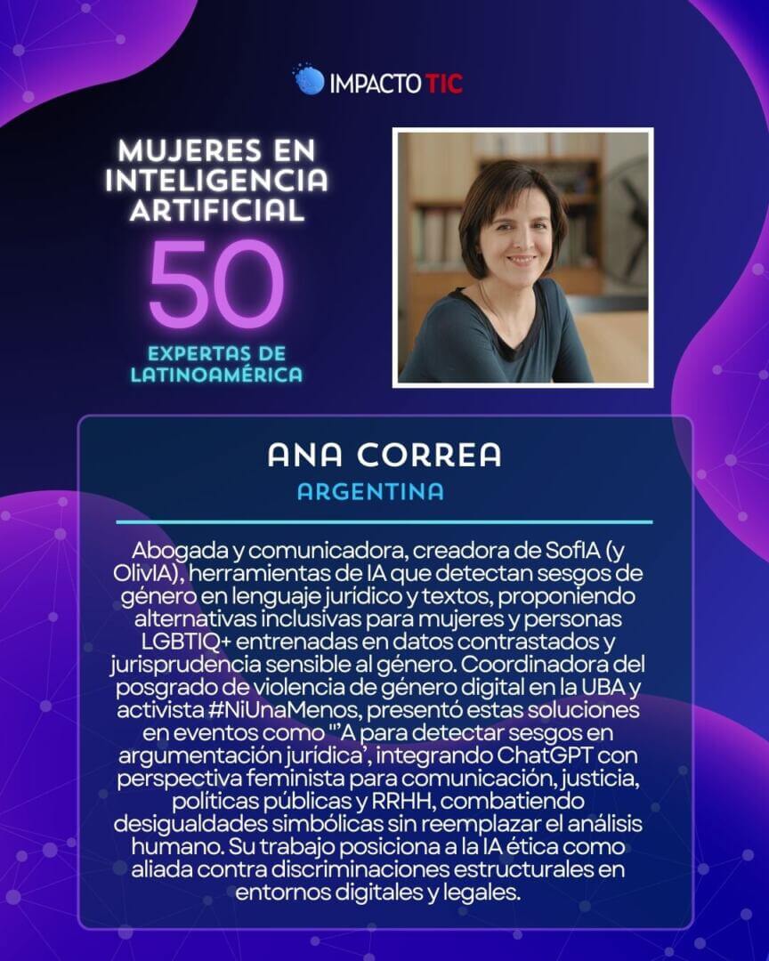 Abogada y comunicadora, creadora de SofIA (y OlivIA), herramientas de IA que detectan sesgos de género en lenguaje jurídico y textos, proponiendo alternativas inclusivas para mujeres y personas LGBTIQ+ entrenadas en datos contrastados y jurisprudencia sensible al género. Coordinadora del posgrado de violencia de género digital en la UBA y activista #NiUnaMenos, presentó estas soluciones en eventos como ‘IA para detectar sesgos en argumentación jurídica’ (UBA 2025), integrando ChatGPT con perspectiva feminista para comunicación, justicia, políticas públicas y RRHH, combatiendo desigualdades simbólicas sin reemplazar el análisis humano. Su trabajo posiciona a la IA ética como aliada contra discriminaciones estructurales en entornos digitales y legales.