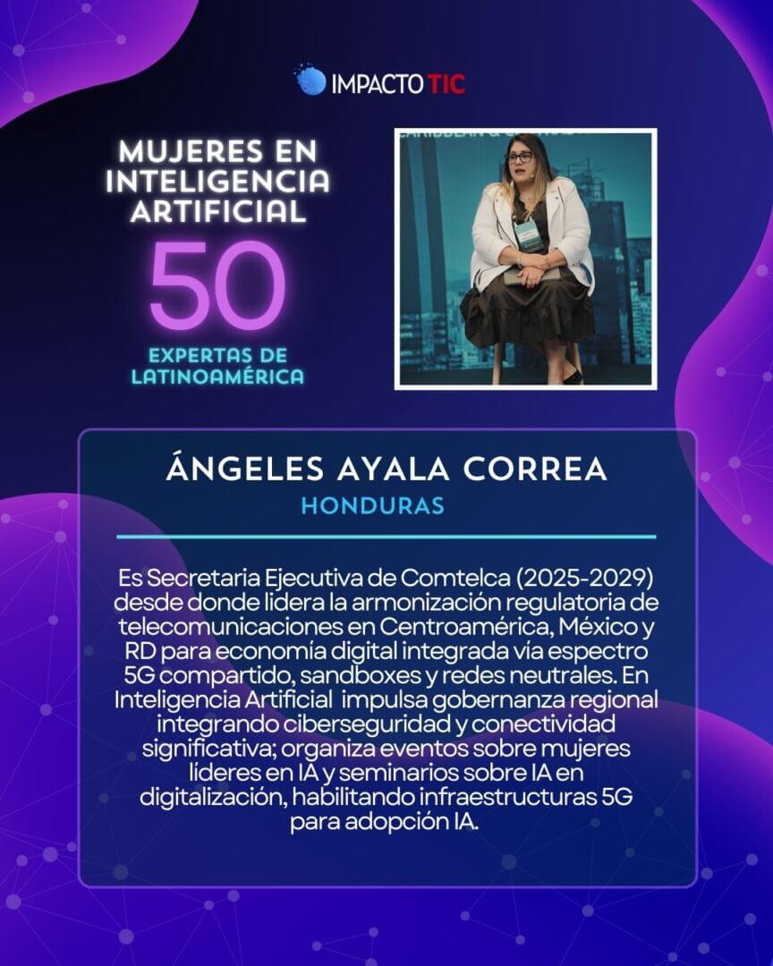 Es Secretaria Ejecutiva de Comtelca (2025-2029) desde donde lidera la armonización regulatoria de telecomunicaciones en Centroamérica, México y RD para economía digital integrada vía espectro 5G compartido, sandboxes y redes neutrales. En Inteligencia Artificial impulsa gobernanza regional integrando ciberseguridad y conectividad significativa; organiza eventos sobre mujeres líderes en IA y seminarios sobre IA en digitalización, habilitando infraestructuras 5G para adopción IA.