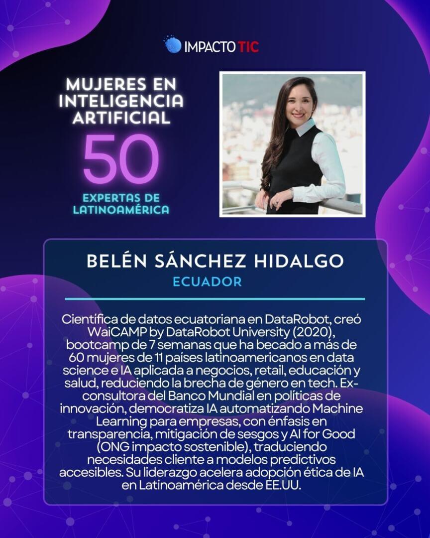 Científica de datos ecuatoriana en DataRobot, creó WaiCAMP by DataRobot University (2020), bootcamp de 7 semanas que ha becado a más de 60 mujeres de 11 países latinoamericanos en data science e IA aplicada a negocios, retail, educación y salud, reduciendo la brecha de género en tech. Ex-consultora del Banco Mundial en políticas de innovación, democratiza IA automatizando Machine Learning para empresas, con énfasis en transparencia, mitigación de sesgos y AI for Good (ONG impacto sostenible), traduciendo necesidades cliente a modelos predictivos accesibles. Su liderazgo acelera adopción ética de IA en Latinoamérica desde EE.UU.