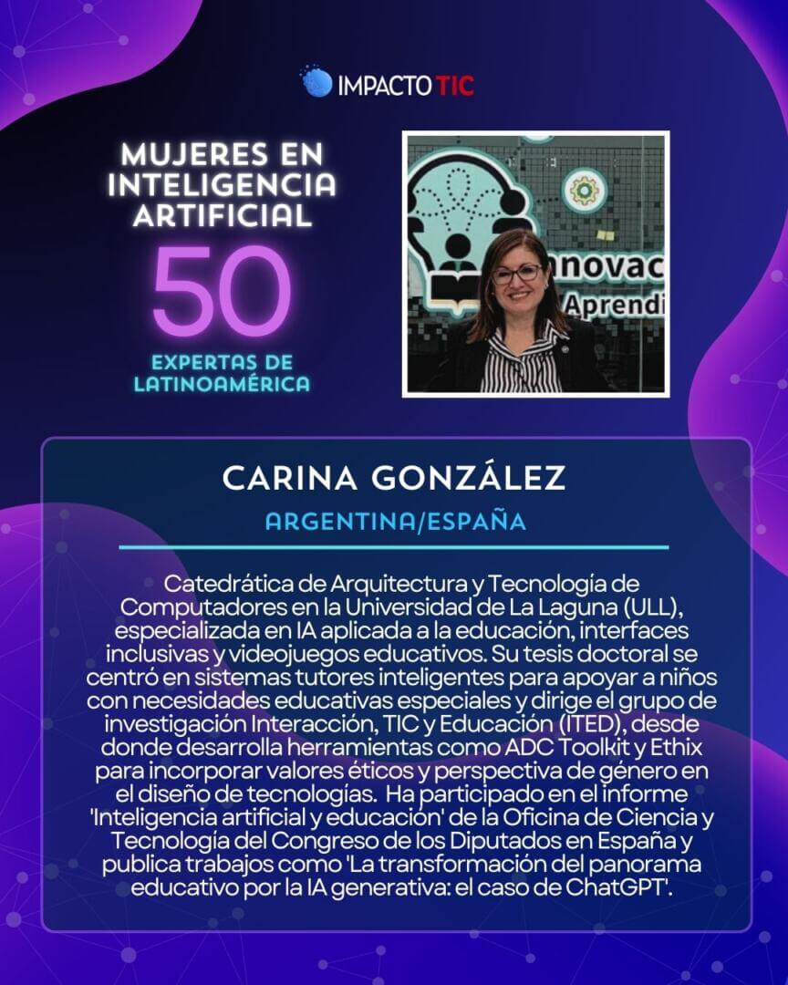 Catedrática de Arquitectura y Tecnología de Computadores en la Universidad de La Laguna (ULL), especializada en Inteligencia Artificial aplicada a la educación, interfaces inclusivas y videojuegos educativos. Su tesis doctoral se centró en sistemas tutores inteligentes para apoyar a niños con necesidades educativas especiales y dirige el grupo de investigación Interacción, TIC y Educación (ITED), desde donde desarrolla herramientas como ADC Toolkit y Ethix para incorporar valores éticos y perspectiva de género en el diseño de tecnologías. Ha participado en el informe ‘Inteligencia Artificial y educación’ de la Oficina de Ciencia y Tecnología del Congreso de los Diputados en España y publica trabajos como ‘El impacto de la Inteligencia Artificial en la educación’ y ‘La transformación del panorama educativo por la IA generativa: el caso de ChatGPT’.