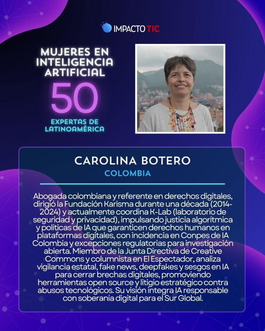 Abogada colombiana y referente en derechos digitales, dirigió la Fundación Karisma durante una década (2014-2024) y actualmente coordina K-Lab (laboratorio de seguridad y privacidad), impulsando justicia algorítmica y políticas de IA que garanticen derechos humanos en plataformas digitales, con incidencia en Conpes de IA Colombia y excepciones regulatorias para investigación abierta. Miembro de la Junta Directiva de Creative Commons y columnista en El Espectador, analiza vigilancia estatal, fake news, deepfakes y sesgos en IA para cerrar brechas digitales, promoviendo herramientas open source y litigio estratégico contra abusos tecnológicos. Su visión integra IA responsable con soberanía digital para el Sur Global.