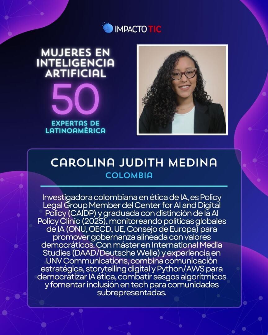 Investigadora colombiana en ética de IA, es Policy Legal Group Member del Center for AI and Digital Policy (CAIDP) y graduada con distinción de la AI Policy Clinic (2025), monitoreando políticas globales de IA (ONU, OECD, UE, Consejo de Europa) para promover gobernanza alineada con valores democráticos. Con máster en International Media Studies (DAAD/Deutsche Welle) y experiencia en UNV Communications, combina comunicación estratégica, storytelling digital y Python/AWS para democratizar IA ética, combatir sesgos algorítmicos y fomentar inclusión en tech para comunidades subrepresentadas.
