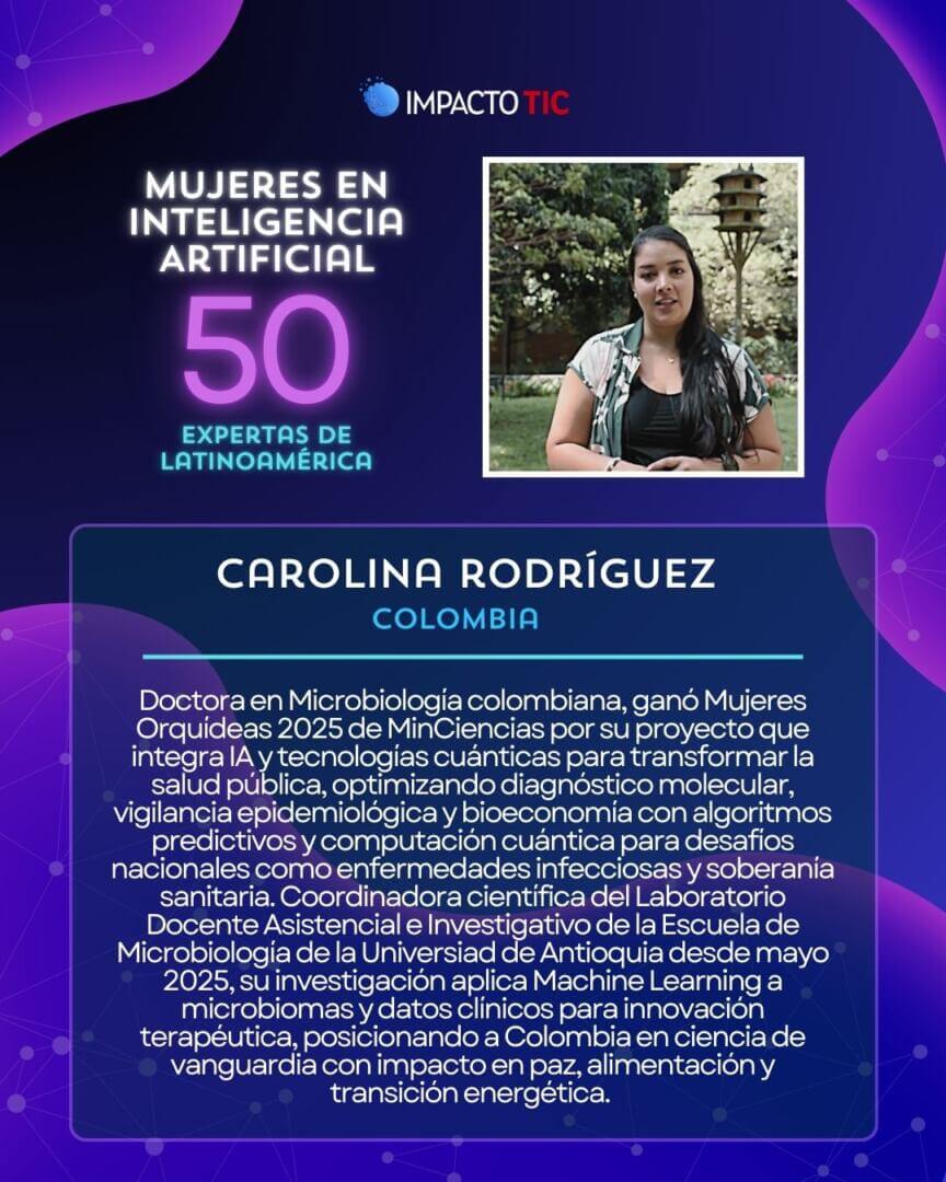 Doctora en Microbiología colombiana, ganó Mujeres Orquídeas 2025 de MinCiencias por su proyecto que integra IA y tecnologías cuánticas para transformar la salud pública, optimizando diagnóstico molecular, vigilancia epidemiológica y bioeconomía con algoritmos predictivos y computación cuántica para desafíos nacionales como enfermedades infecciosas y soberanía sanitaria. Coordinadora científica del Laboratorio Docente Asistencial e Investigativo de la Escuela de Microbiología de la Universiad de Antioquia desde mayo 2025, su investigación aplica Machine Learning a microbiomas y datos clínicos para innovación terapéutica, posicionando a Colombia en ciencia de vanguardia con impacto en paz, alimentación y transición energética. Su liderazgo acelera la brecha de género en IA cuántica.