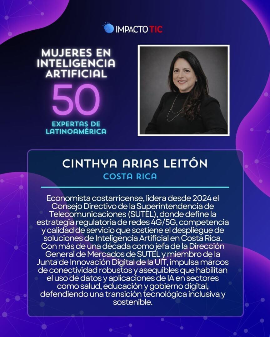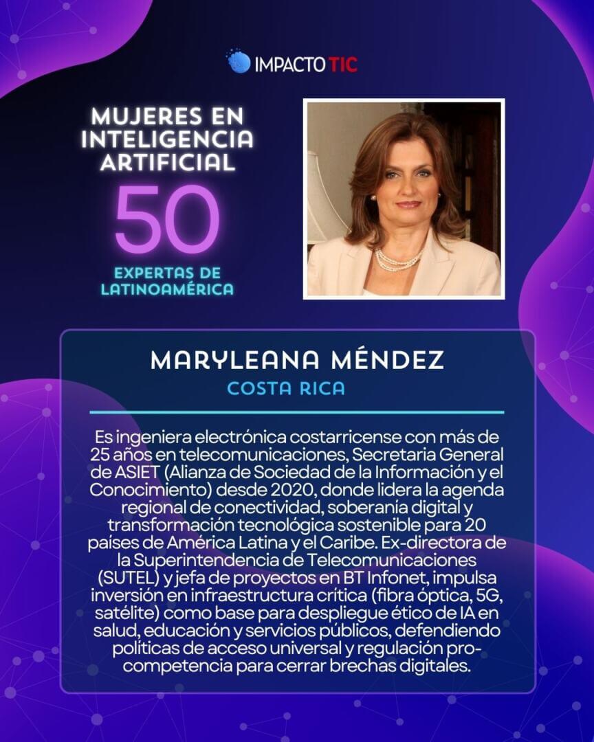 Es ingeniera electrónica costarricense con más de 25 años en telecomunicaciones, Secretaria General de ASIET (Alianza de Sociedad de la Información y el Conocimiento) desde 2020, donde lidera la agenda regional de conectividad, soberanía digital y transformación tecnológica sostenible para 20 países de América Latina y el Caribe. Ex-directora de la Superintendencia de Telecomunicaciones (SUTEL) y jefa de proyectos en BT Infonet, impulsa inversión en infraestructura crítica (fibra óptica, 5G, satélite) como base para despliegue ético de IA en salud, educación y servicios públicos, defendiendo políticas de acceso universal y regulación pro-competencia para cerrar brechas digitales.