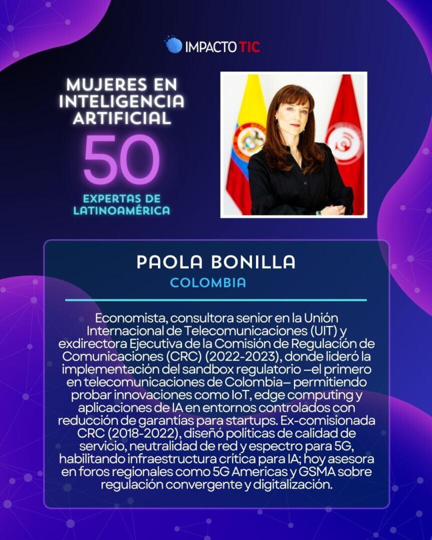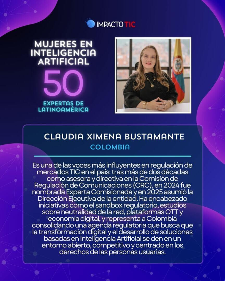 Ingeniera electrónica colombiana, es una de las voces más influyentes en regulación de mercados TIC en el país: tras más de dos décadas como asesora y directiva en la Comisión de Regulación de Comunicaciones (CRC), en 2024 fue nombrada Experta Comisionada y en 2025 asumió la Dirección Ejecutiva de la entidad, desde donde lidera marcos que promueven la competencia en servicios digitales, la calidad de telefonía, internet y TV, y el acceso a datos para innovación. Ha encabezado iniciativas como el sandbox regulatorio, estudios sobre neutralidad de la red, plataformas OTT y economía digital, y representa a Colombia en foros como CITEL‑OEA y Regulatel, consolidando una agenda regulatoria que busca que la transformación digital y el desarrollo de soluciones basadas en Inteligencia Artificial se den en un entorno abierto, competitivo y centrado en los derechos de las personas usuarias.