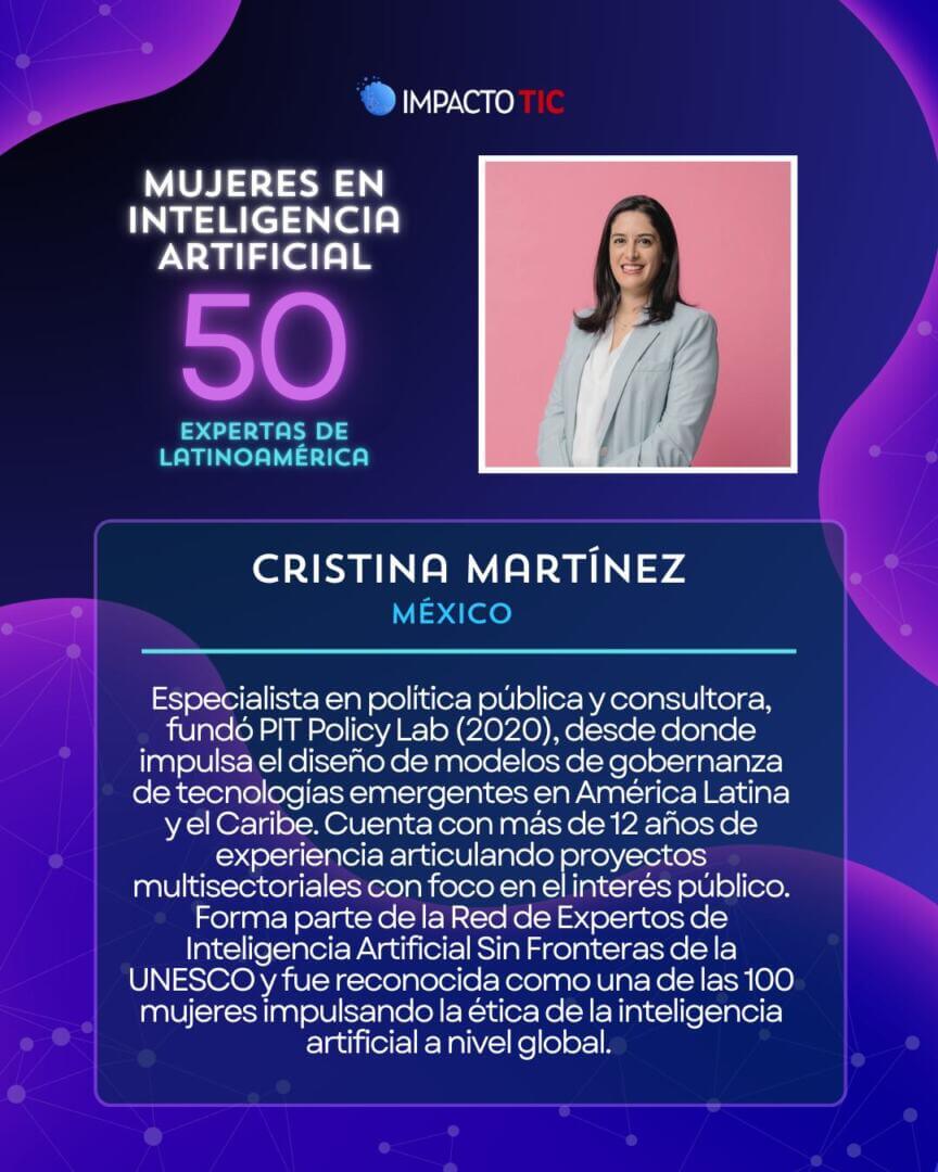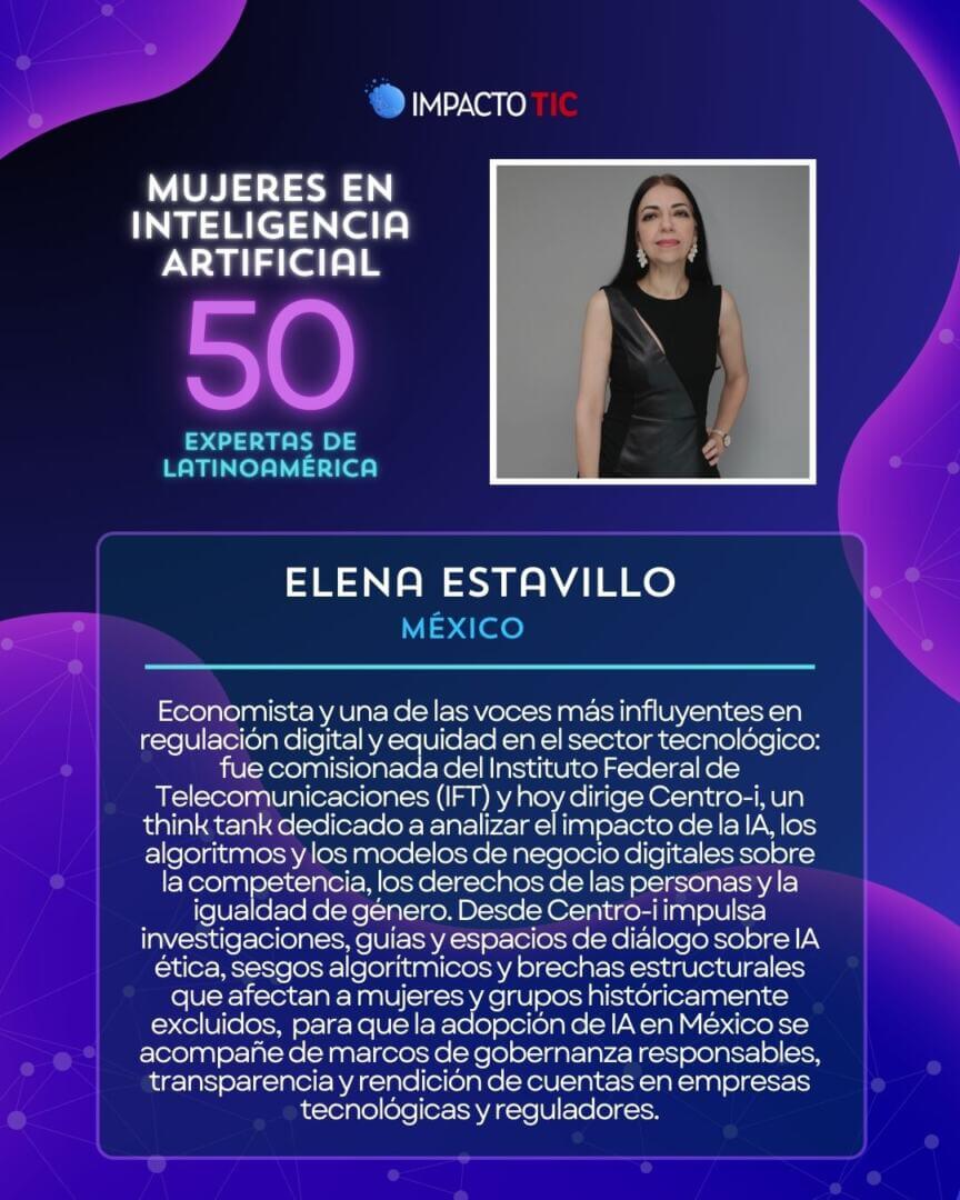 Economista y una de las voces más influyentes en regulación digital y equidad en el sector tecnológico: fue comisionada del Instituto Federal de Telecomunicaciones (IFT) y hoy dirige Centro-i, un think tank dedicado a analizar el impacto de la Inteligencia Artificial, los algoritmos y los modelos de negocio digitales sobre la competencia, los derechos de las personas y la igualdad de género. Desde Centro-i impulsa investigaciones, guías y espacios de diálogo sobre IA ética, sesgos algorítmicos y brechas estructurales que afectan a mujeres y grupos históricamente excluidos, y participa activamente en foros nacionales e internacionales para que la adopción de IA en México se acompañe de marcos de gobernanza responsables, transparencia y rendición de cuentas en empresas tecnológicas y reguladores.