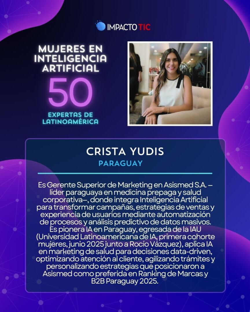 Es Gerente Superior de Marketing en Asismed S.A. —líder paraguaya en medicina prepaga y salud corporativa—, donde integra Inteligencia Artificial para transformar campañas, estrategias de ventas y experiencia de usuarios mediante automatización de procesos y análisis predictivo de datos masivos. Es pionera IA en Paraguay, egresada de la IAU (Universidad Latinoamericana de IA, primera cohorte mujeres, junio 2025 junto a Rocío Vázquez), aplica IA en marketing de salud para decisiones data-driven, optimizando atención al cliente, agilizando trámites y personalizando estrategias que posicionaron a Asismed como preferida en Ranking de Marcas y B2B Paraguay 2025.