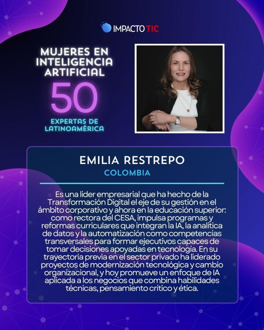 Es una líder empresarial que ha hecho de la Transformación Digital el eje de su gestión en el ámbito corporativo y ahora en la educación superior: como rectora del CESA, impulsa programas y reformas curriculares que integran la Inteligencia Artificial, la analítica de datos y la automatización como competencias transversales para formar ejecutivos capaces de tomar decisiones apoyadas en tecnología. En su trayectoria previa en el sector privado ha liderado proyectos de modernización tecnológica y cambio organizacional, y hoy promueve un enfoque de IA aplicada a los negocios que combina habilidades técnicas, pensamiento crítico y ética, de modo que las y los futuros líderes puedan aprovechar estas herramientas para innovar en modelos de negocio, mejorar la productividad y responder de manera responsable a los desafíos económicos y sociales del país.