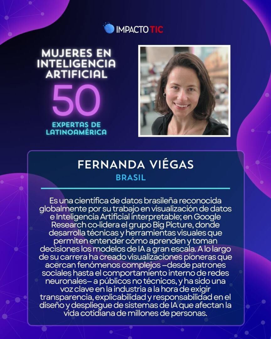 Es una científica de datos brasileña reconocida globalmente por su trabajo en visualización de datos e Inteligencia Artificial interpretable; en Google Research co‑lidera el grupo Big Picture, donde desarrolla técnicas y herramientas visuales que permiten entender cómo aprenden y toman decisiones los modelos de IA a gran escala. A lo largo de su carrera ha creado visualizaciones pioneras que acercan fenómenos complejos —desde patrones sociales hasta el comportamiento interno de redes neuronales— a públicos no técnicos, y ha sido una voz clave en la industria a la hora de exigir transparencia, explicabilidad y responsabilidad en el diseño y despliegue de sistemas de IA que afectan la vida cotidiana de millones de personas.