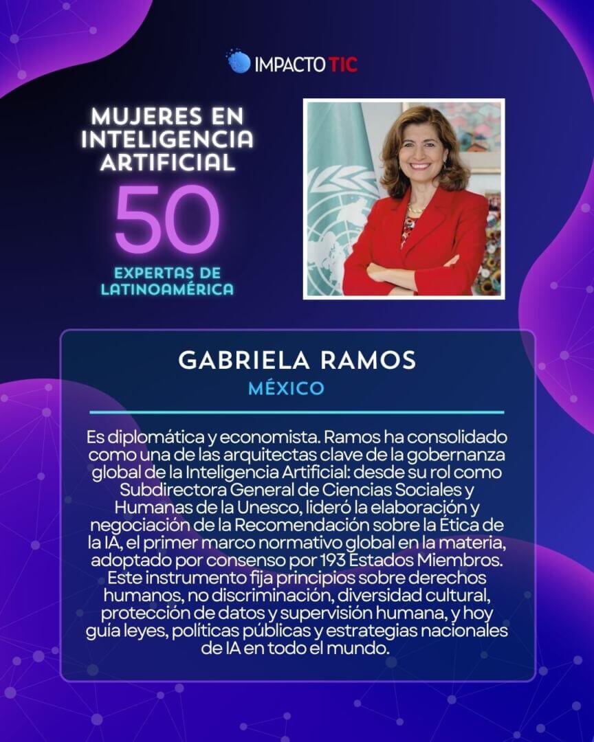 Es diplomática y economista. Ramos ha consolidado como una de las arquitectas clave de la gobernanza global de la Inteligencia Artificial: desde su rol como Subdirectora General de Ciencias Sociales y Humanas de la Unesco, lideró la elaboración y negociación de la Recomendación sobre la Ética de la IA, el primer marco normativo global en la materia, adoptado por consenso por 193 Estados Miembros. Este instrumento fija principios sobre derechos humanos, no discriminación, diversidad cultural, protección de datos y supervisión humana, y hoy guía leyes, políticas públicas y estrategias nacionales de IA en todo el mundo. Ramos ha defendido de manera sistemática que la IA solo puede considerarse exitosa si reduce desigualdades en lugar de profundizarlas, poniendo en el centro a mujeres, jóvenes y comunidades históricamente marginadas.