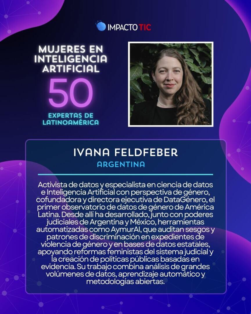 Activista de datos y especialista en ciencia de datos e Inteligencia Artificial con perspectiva de género, cofundadora y directora ejecutiva de DataGénero, el primer observatorio de datos de género de América Latina. Desde allí ha desarrollado, junto con poderes judiciales de Argentina y México, herramientas automatizadas como AymurAI, que auditan sesgos y patrones de discriminación en expedientes de violencia de género y en bases de datos estatales, apoyando reformas feministas del sistema judicial y la creación de políticas públicas basadas en evidencia. Su trabajo combina análisis de grandes volúmenes de datos, aprendizaje automático y metodologías abiertas para hacer visibles injusticias estructurales y proponer cambios concretos en la producción y uso de datos públicos.