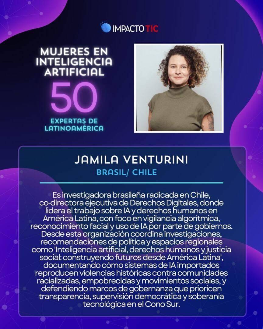 Es investigadora brasileña radicada en Chile, co‑directora ejecutiva de Derechos Digitales, donde lidera el trabajo sobre Inteligencia Artificial y derechos humanos en América Latina, con foco en vigilancia algorítmica, reconocimiento facial y uso de IA por parte de gobiernos. Desde esta organización coordina investigaciones, recomendaciones de política y espacios regionales como ‘Inteligencia artificial, derechos humanos y justicia social: construyendo futuros desde América Latina’, documentando cómo sistemas de IA importados reproducen violencias históricas contra comunidades racializadas, empobrecidas y movimientos sociales, y defendiendo marcos de gobernanza que prioricen transparencia, supervisión democrática y soberanía tecnológica en el Cono Sur.