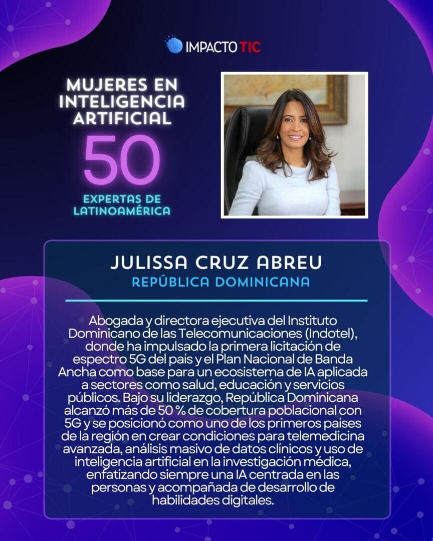 Abogada y directora ejecutiva del Instituto Dominicano de las Telecomunicaciones (Indotel), donde ha impulsado la primera licitación de espectro 5G del país y el Plan Nacional de Banda Ancha como base para un ecosistema de IA aplicada a sectores como salud, educación y servicios públicos. Bajo su liderazgo, República Dominicana alcanzó más de 50 % de cobertura poblacional con 5G y se posicionó como uno de los primeros países de la región en crear condiciones para telemedicina avanzada, análisis masivo de datos clínicos y uso de Inteligencia Artificial en la investigación médica, enfatizando siempre una IA centrada en las personas y acompañada de desarrollo de habilidades digitales.