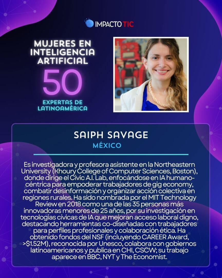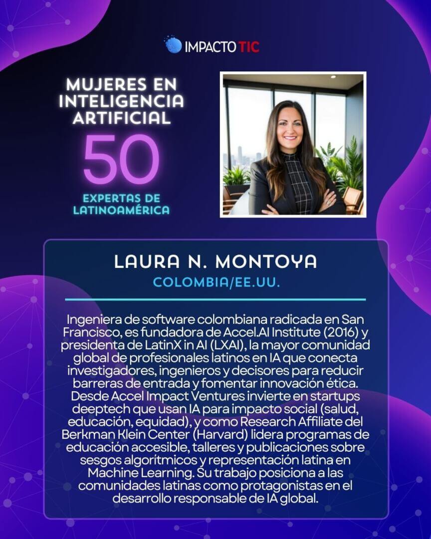 Ingeniera de software colombiana radicada en San Francisco, es fundadora de Accel.AI Institute (2016) y presidenta de LatinX in AI (LXAI), la mayor comunidad global de profesionales latinos en IA que conecta investigadores, ingenieros y decisores para reducir barreras de entrada y fomentar innovación ética. Desde Accel Impact Ventures invierte en startups deeptech que usan IA para impacto social (salud, educación, equidad), y como Research Affiliate del Berkman Klein Center (Harvard) lidera programas de educación accesible, talleres y publicaciones sobre sesgos algorítmicos y representación latina en Machine Learning. Su trabajo posiciona a las comunidades latinas como protagonistas en el desarrollo responsable de IA global.