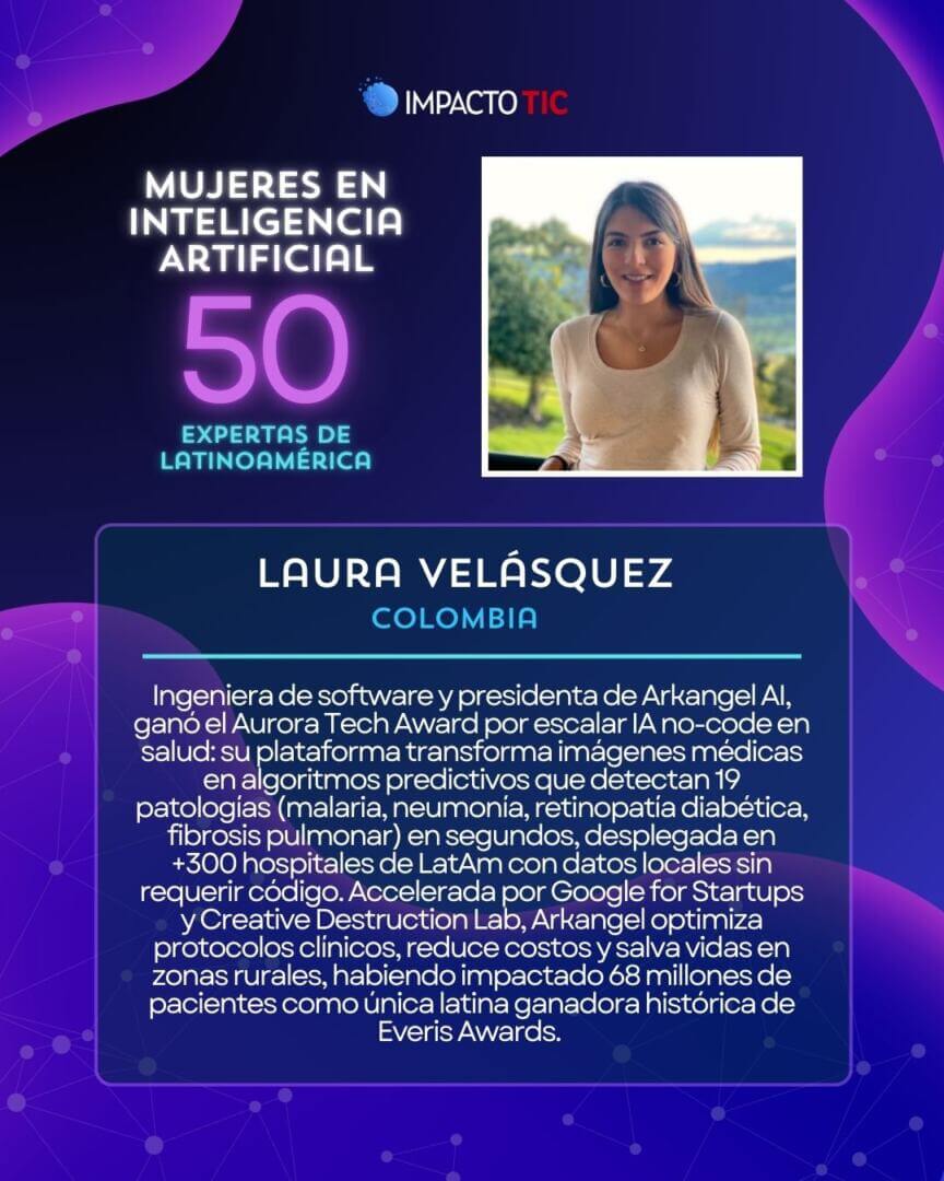 Ingeniera de software y presidenta de Arkangel AI, ganó el Aurora Tech Award por escalar IA no-code en salud: su plataforma transforma imágenes médicas en algoritmos predictivos que detectan 19 patologías (malaria, neumonía, retinopatía diabética, fibrosis pulmonar) en segundos, desplegada en +300 hospitales de LatAm con datos locales sin requerir código. Accelerada por Google for Startups y Creative Destruction Lab, Arkangel optimiza protocolos clínicos, reduce costos y salva vidas en zonas rurales, habiendo impactado 68 millones de pacientes como única latina ganadora histórica de Everis Awards.