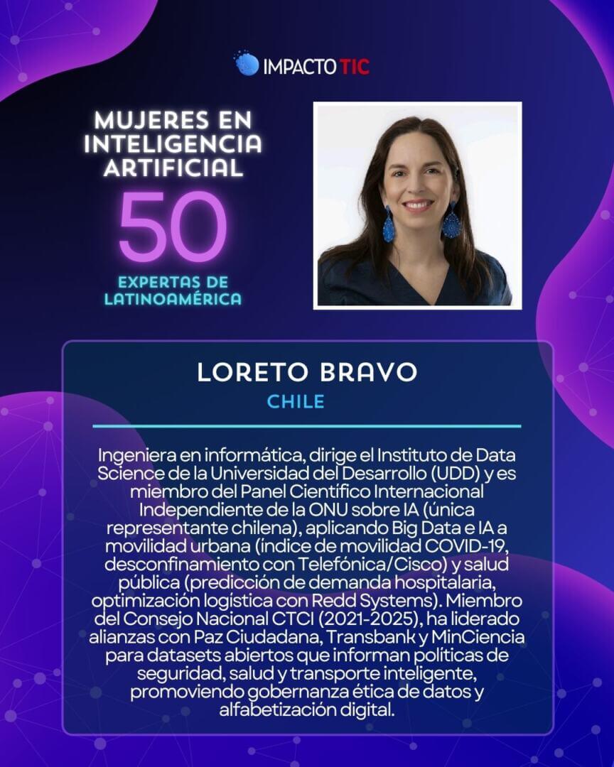 Ingeniera en informática, dirige el Instituto de Data Science de la Universidad del Desarrollo (UDD) y es miembro del Panel Científico Internacional Independiente de la ONU sobre IA (única representante chilena), aplicando Big Data e IA a movilidad urbana (índice de movilidad COVID-19, desconfinamiento con Telefónica/Cisco) y salud pública (predicción de demanda hospitalaria, optimización logística con Redd Systems). Miembro del Consejo Nacional CTCI (2021-2025), ha liderado alianzas con Paz Ciudadana, Transbank y MinCiencia para datasets abiertos que informan políticas de seguridad, salud y transporte inteligente, promoviendo gobernanza ética de datos y alfabetización digital.