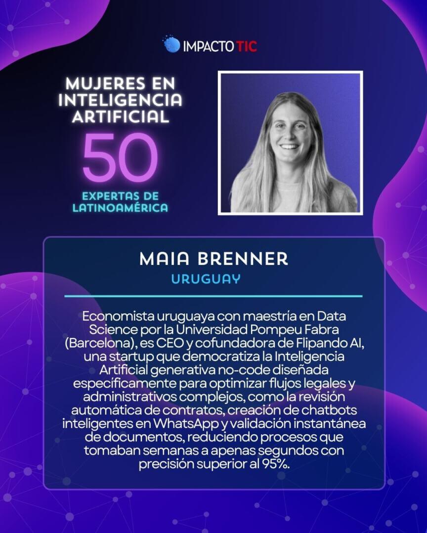 economista uruguaya con maestría en Data Science por la Universidad Pompeu Fabra (Barcelona), es CEO y cofundadora de Flipando AI, una startup que democratiza la Inteligencia Artificial generativa no-code diseñada específicamente para optimizar flujos legales y administrativos complejos, como la revisión automática de contratos, creación de chatbots inteligentes en WhatsApp y validación instantánea de documentos, reduciendo procesos que tomaban semanas a apenas segundos con precisión superior al 95%.