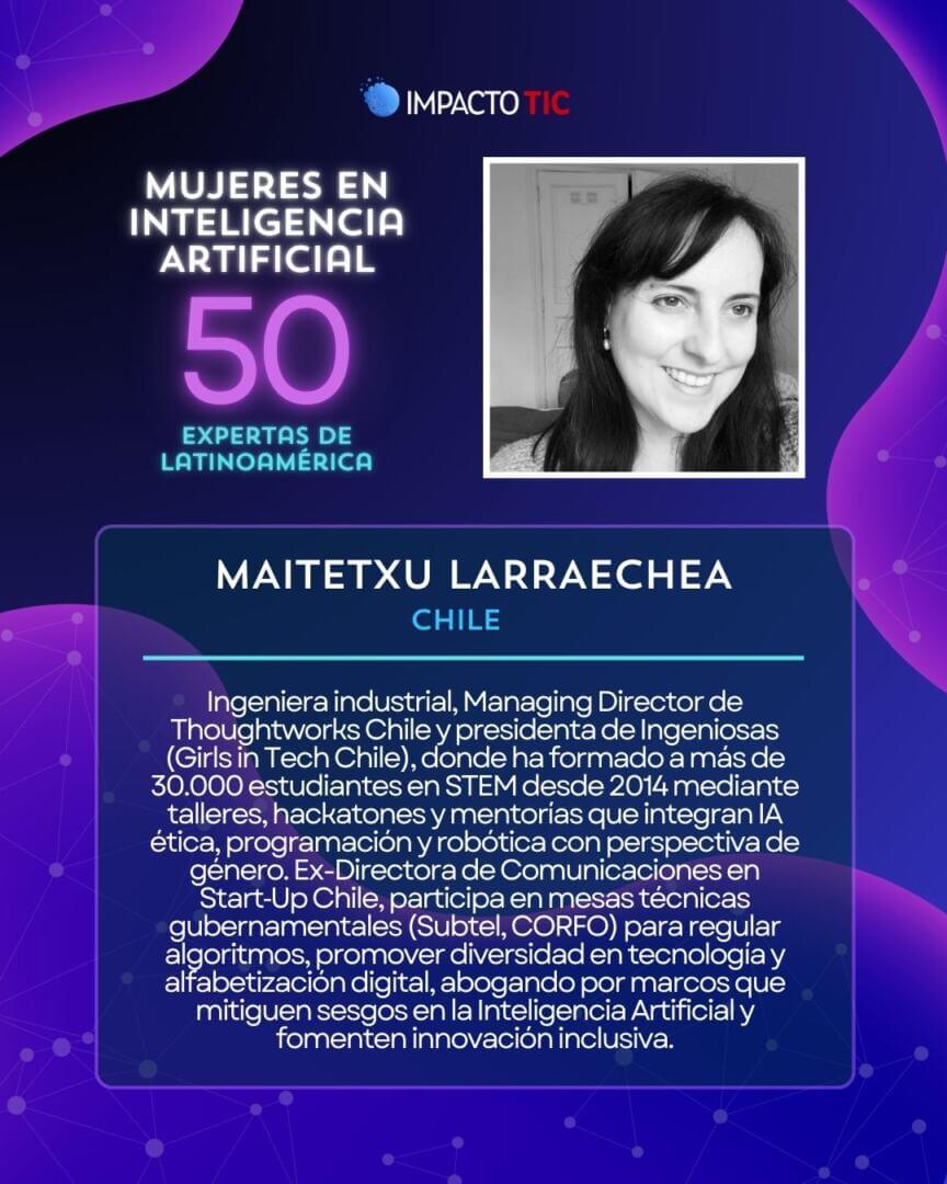Ingeniera industrial, Managing Director de Thoughtworks Chile y presidenta de Ingeniosas (Girls in Tech Chile), donde ha formado a más de 30.000 estudiantes en STEM desde 2014 mediante talleres, hackatones y mentorías que integran IA ética, programación y robótica con perspectiva de género. Exdirectora de Comunicaciones en Start‑Up Chile, participa en mesas técnicas gubernamentales (Subtel, CORFO) para regular algoritmos, promover diversidad en tecnología y alfabetización digital, abogando por marcos que mitiguen sesgos en la Inteligencia Artificial y fomenten innovación inclusiva.