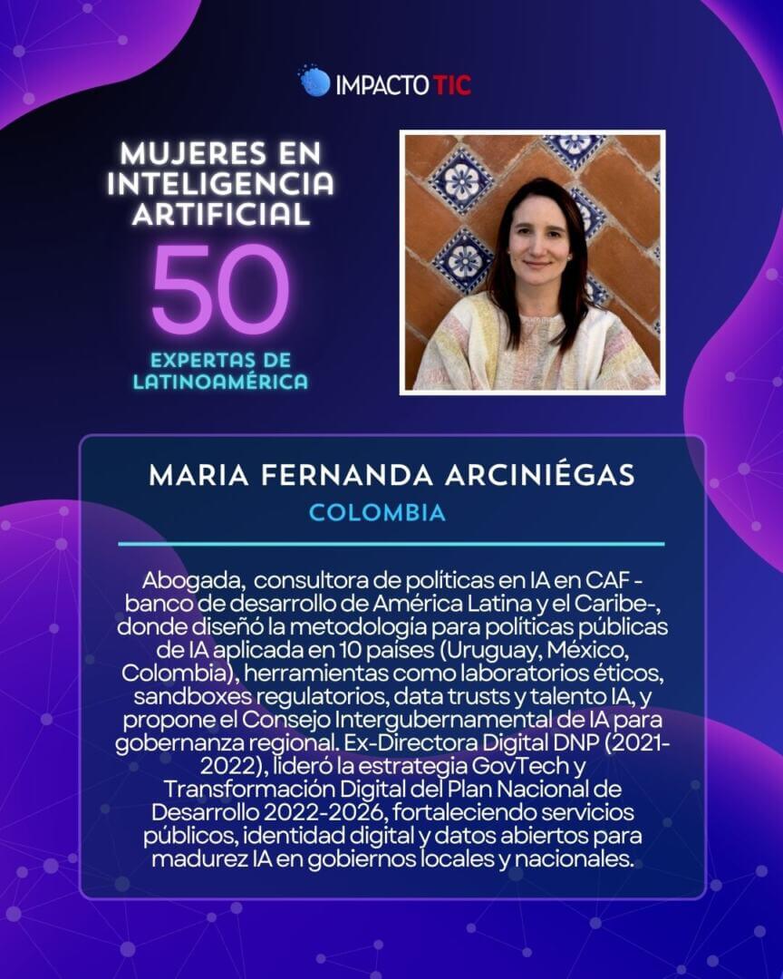 Abogada, consultora de políticas en IA en CAF -banco de desarrollo de América Latina y el Caribe-, donde diseñó la metodología para políticas públicas de IA aplicada en 10 países (Uruguay, México, Colombia), herramientas como laboratorios éticos, sandboxes regulatorios, data trusts y talento IA, y propone el Consejo Intergubernamental de IA para gobernanza regional. Ex-Directora Digital DNP (2021-2022), lideró la estrategia GovTech y Transformación Digital del Plan Nacional de Desarrollo 2022-2026, fortaleciendo servicios públicos, identidad digital y datos abiertos para madurez IA en gobiernos locales y nacionales.