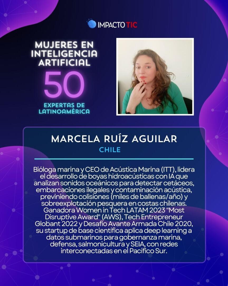 Bióloga marina y CEO de Acústica Marina (ITT), lidera el desarrollo de boyas hidroacústicas con IA que analizan sonidos oceánicos para detectar cetáceos, embarcaciones ilegales y contaminación acústica, previniendo colisiones (miles de ballenas/año) y sobreexplotación pesquera en costas chilenas. Ganadora Women in Tech LATAM 2023 “Most Disruptive Award” (AWS), Tech Entrepreneur Globant 2022 y Desafío Avante Armada Chile 2020, su startup de base científica aplica deep learning a datos submarinos para gobernanza marina, defensa, salmonicultura y SEIA, con redes interconectadas en el Pacífico Sur.