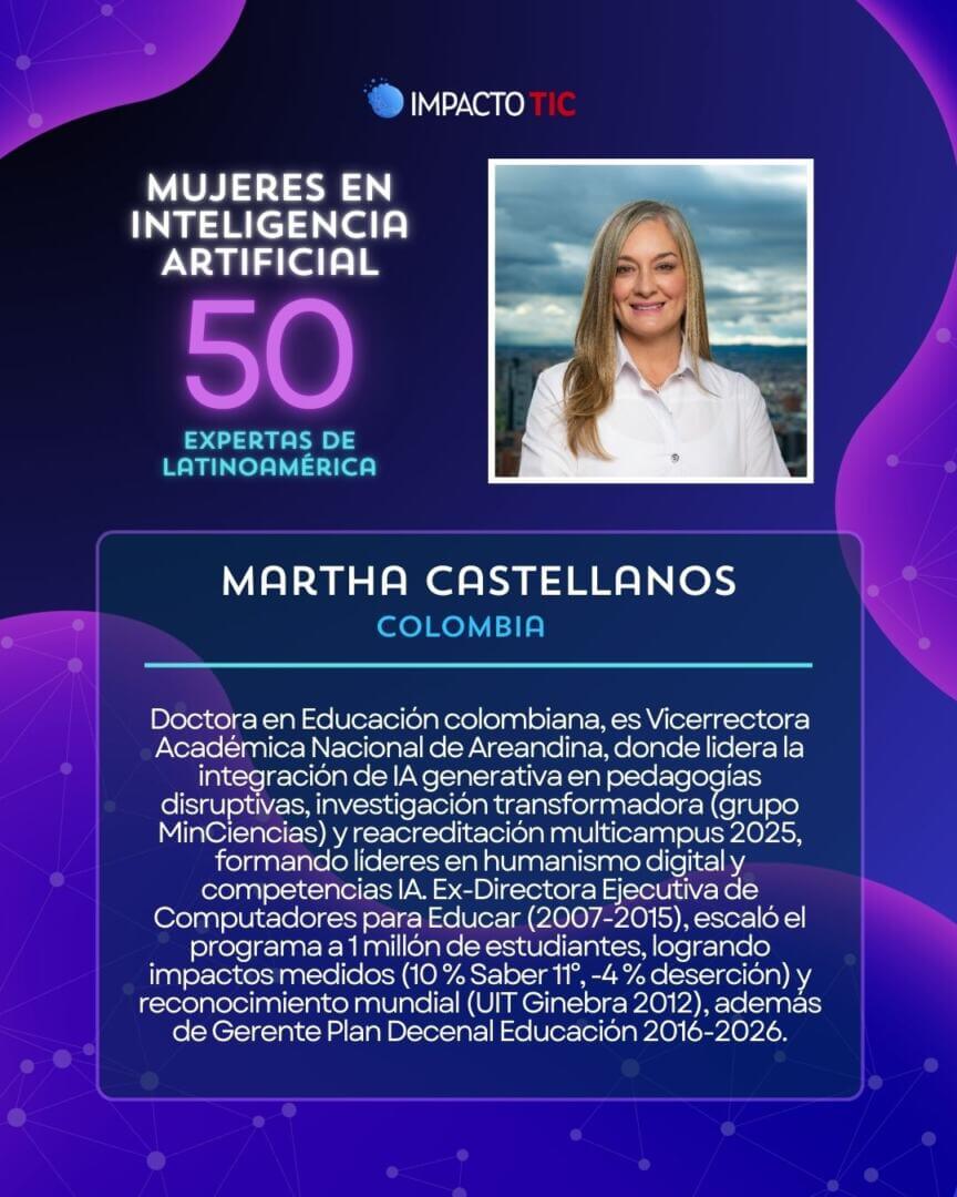 Doctora en Educación colombiana, es Vicerrectora Académica Nacional de Areandina, donde lidera la integración de IA generativa en pedagogías disruptivas, investigación transformadora (grupo MinCiencias) y reacreditación multicampus 2025, formando líderes en humanismo digital y competencias IA. Ex-Directora Ejecutiva de Computadores para Educar (2007-2015), escaló el programa a 1 millón de estudiantes, logrando impactos medidos (10 % Saber 11°, -4 % deserción) y reconocimiento mundial (UIT Ginebra 2012), además de Gerente Plan Decenal Educación 2016-2026.