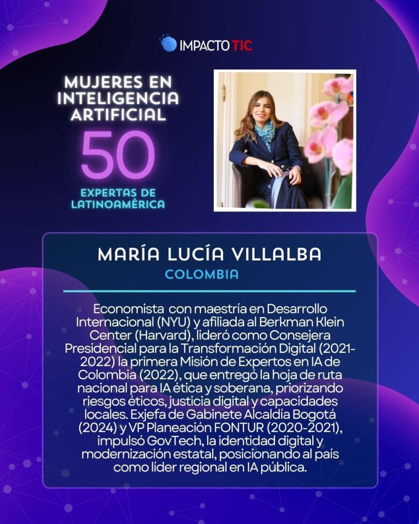 Economista con maestría en Desarrollo Internacional (NYU) y afiliada al Berkman Klein Center (Harvard), lideró como Consejera Presidencial para la Transformación Digital (2021-2022) la primera Misión de Expertos en IA de Colombia (2022), que entregó la hoja de ruta nacional para IA ética y soberana, priorizando riesgos éticos, justicia digital y capacidades locales. Exjefa de Gabinete Alcaldía Bogotá (2024) y VP Planeación FONTUR (2020-2021), impulsó GovTech, identidad digital y modernización estatal, posicionando al país como líder regional en IA pública.