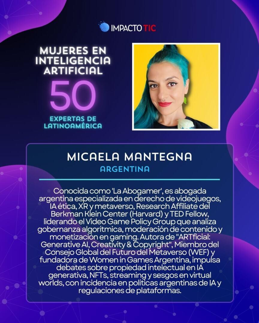 Conocida como ‘La Abogamer’, es abogada argentina especializada en derecho de videojuegos, IA ética, XR y metaverso, Research Affiliate del Berkman Klein Center (Harvard) y TED Fellow, liderando el Video Game Policy Group que analiza gobernanza algorítmica, moderación de contenido y monetización en gaming. Autora de “ARTficial: Generative AI, Creativity & Copyright”, Miembro del Consejo Global del Futuro del Metaverso (WEF) y fundadora de Women in Games Argentina, impulsa debates sobre propiedad intelectual en IA generativa, NFTs, streaming y sesgos en virtual worlds, con incidencia en políticas argentinas de IA y regulaciones de plataformas.