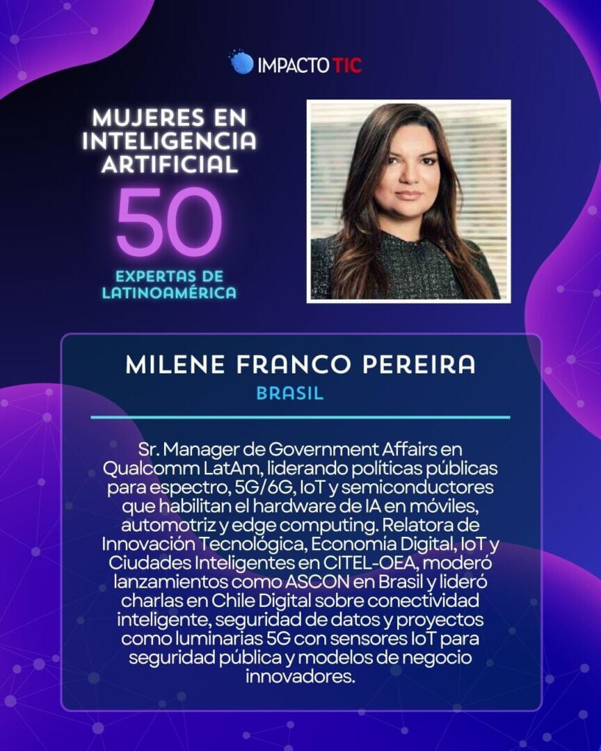 Es Sr. Manager de Government Affairs en Qualcomm LatAm, liderando políticas públicas para espectro, 5G/6G, IoT y semiconductores que habilitan el hardware de IA en móviles, automotriz y edge computing. Relatora de Innovación Tecnológica, Economía Digital, IoT y Ciudades Inteligentes en CITEL-OEA, moderó lanzamientos como ASCON en Brasil y lideró charlas en Chile Digital sobre conectividad inteligente, seguridad de datos y proyectos como luminarias 5G con sensores IoT para seguridad pública y modelos de negocio innovadores.