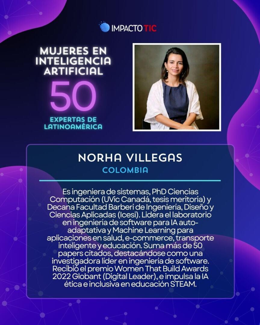 Es ingeniera de sistemas, PhD Ciencias Computación (UVic Canadá, tesis meritoria) y Decana Facultad Barberi de Ingeniería, Diseño y Ciencias Aplicadas (Icesi). Lidera el DRISO Lab en ingeniería de software para IA auto-adaptativa y Machine Learning para dominios como salud, e-commerce, transporte inteligente y educación. Suma más de 50 papers citados, destacándose como una investigadora líder en ingeniería de software. Recibió el premio Women That Build Awards 2022 Globant (Digital Leader), e impulsa la IA ética e inclusiva en educación STEAM.