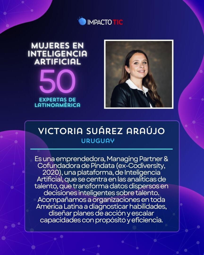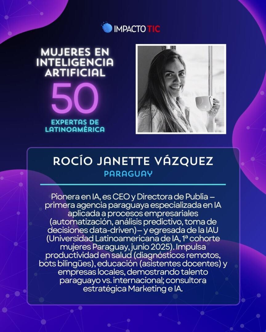 Pionera en IA, es CEO y Directora de Publia —primera agencia paraguaya especializada en IA aplicada a procesos empresariales (automatización, análisis predictivo, toma de decisiones data-driven)— y egresada de la IAU (Universidad Latinoamericana de IA, 1ª cohorte mujeres Paraguay, junio 2025). Impulsa productividad en salud (diagnósticos remotos, bots bilingües), educación (asistentes docentes) y empresas locales, demostrando talento paraguayo vs. internacional; consultora estratégica Marketing e IA.