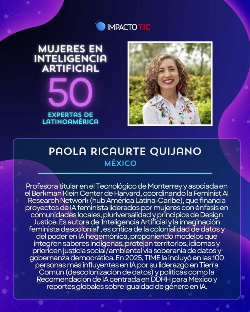 Académica mexicana-ecuatoriana, es profesora titular en el Tecnológico de Monterrey y asociada en el Berkman Klein Center de Harvard, coordinando la Feminist AI Research Network (hub América Latina-Caribe), que financia proyectos de IA feminista liderados por mujeres con énfasis en comunidades locales, pluriversalidad y principios de Design Justice. Es autora de ‘Inteligencia Artificial y la imaginación feminista descolonial’ , es crítica de la colonialidad de datos y del poder en IA hegemónica, proponiendo modelos que integren saberes indígenas, protejan territorios, idiomas y prioricen justicia social/ambiental vía soberanía de datos y gobernanza democrática. En 2025, TIME la incluyó en las 100 personas más influyentes en IA por su liderazgo en Tierra Común (descolonización de datos) y políticas como la Recomendación de IA centrada en DDHH para México y reportes globales sobre igualdad de género en IA.