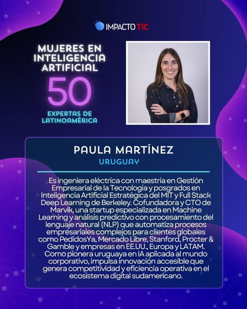 Es ingeniera eléctrica con maestría en Gestión Empresarial de la Tecnología y posgrados en Inteligencia Artificial Estratégica del MIT y Full Stack Deep Learning de Berkeley. Cofundadora y CTO de Marvik, una startup especializada en Machine Learning y análisis predictivo con procesamiento del lenguaje natural (NLP) que automatiza procesos empresariales complejos para clientes globales como PedidosYa, Mercado Libre, Stanford, Procter & Gamble y empresas en EE.UU., Europa y LATAM. Como pionera uruguaya en IA aplicada al mundo corporativo, impulsa innovación accesible que genera competitividad y eficiencia operativa en el ecosistema digital sudamericano.
