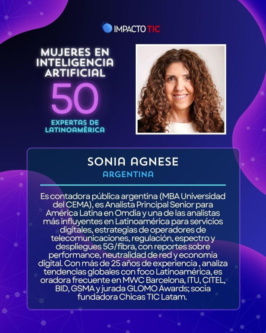 Es contadora pública argentina (MBA Universidad del CEMA), es Analista Principal Senior para América Latina en Omdia y una de las analistas más influyentes en Latinoamérica para servicios digitales, estrategias de operadores de telecomunicaciones, regulación, espectro y despliegues 5G/fibra, con reportes sobre performance, neutralidad de red y economía digital. Con más de 25 años de experiencia , analiza tendencias globales con foco Latinoamérica, es oradora frecuente en MWC Barcelona, ITU, CITEL, BID, GSMA y jurada GLOMO Awards; socia fundadora Chicas TIC Latam.