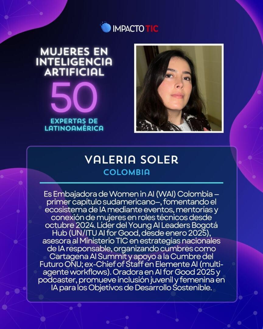 Es Embajadora de Women in AI (WAI) Colombia —primer capítulo sudamericano—, fomentando el ecosistema de IA mediante eventos, mentorías y conexión de mujeres en roles técnicos desde octubre 2024. Líder del Young AI Leaders Bogotá Hub (UN/ITU AI for Good, desde enero 2025), asesora al Ministerio TIC en estrategias nacionales de IA responsable, organizando cumbres como Cartagena AI Summit y apoyo a la Cumbre del Futuro ONU; ex-Chief of Staff en Elemente AI (multi-agente workflows). Oradora en AI for Good 2025 y podcaster, promueve inclusión juvenil y femenina en IA para los Objetivos de Desarrollo Sostenible.