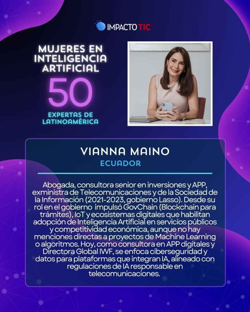 Abogada, consultora senior en inversiones y APP, exministra de Telecomunicaciones y de la Sociedad de la Información (2021-2023, gobierno Lasso). Desde su rol en el gobierno impulsó GovChain (Blockchain para trámites), IoT y ecosistemas digitales que habilitan adopción de Inteligencia Artificial en servicios públicos y competitividad económica, aunque no hay menciones directas a proyectos de Machine Learning o algoritmos. Hoy, como consultora en APP digitales y Directora Global IWF, se enfoca ciberseguridad y datos para plataformas que integran IA, alineado con regulaciones de IA responsable en telecomunicaciones.
