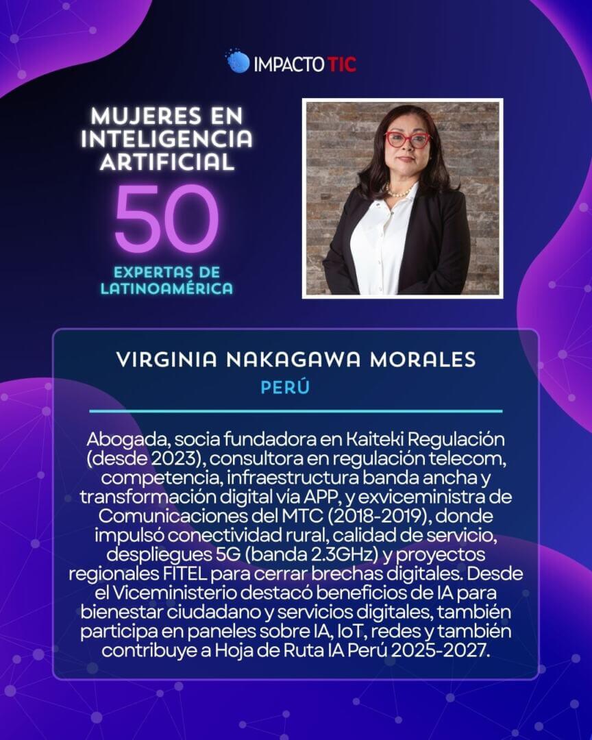 Abogada, socia fundadora en Kaiteki Regulación (desde 2023), consultora en regulación telecom, competencia, infraestructura banda ancha y transformación digital vía APP, y exviceministra de Comunicaciones del MTC (2018-2019), donde impulsó conectividad rural, calidad de servicio, despliegues 5G (banda 2.3GHz) y proyectos regionales FITEL para cerrar brechas digitales. Desde el Viceministerio destacó beneficios de IA para bienestar ciudadano y servicios digitales, también participa en paneles sobre IA, IoT, redes y también contribuye a Hoja de Ruta IA Perú 2025-2027.