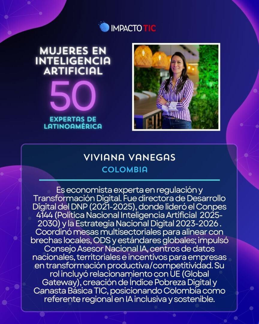 Es economista experta en regulación y Transformación Digital, trabajó en la UE (Embajada en Colombia, alineación políticas digitales) y es exdirectora de Desarrollo Digital del DNP (2021-2025), donde lideró el Conpes 4144 (Política Nacional Inteligencia Artificial 2025-2030) y la Estrategia Nacional Digital 2023-2026 con foco en convergencia medios, ciberseguridad y pobreza digital (Índice IPD, Canasta Básica TIC). Coordinó mesas multisectoriales (MinTIC, MinCiencias, DAPRE, privados, academia, regiones) para alinear con brechas locales, ODS y estándares globales; impulsó Consejo Asesor Nacional IA, centros de datos nacionales, territoriales e incentivos para empresas en transformación productiva/competitividad. Su rol incluyó relacionamiento con UE (Global Gateway), creación de Índice Pobreza Digital y Canasta Básica TIC, posicionando Colombia como referente regional en IA inclusiva y sostenible.