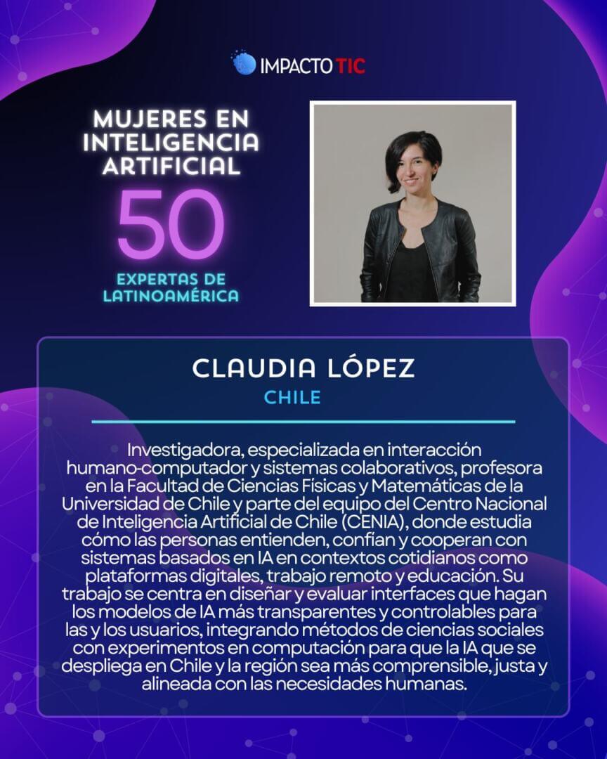 Investigadora, especializada en interacción humano‑computador y sistemas colaborativos, profesora en la Facultad de Ciencias Físicas y Matemáticas de la Universidad de Chile y parte del equipo del Centro Nacional de Inteligencia Artificial de Chile (CENIA), donde estudia cómo las personas entienden, confían y cooperan con sistemas basados en IA en contextos cotidianos como plataformas digitales, trabajo remoto y educación. En su trabajo reciente se ha centrado en diseñar y evaluar interfaces que hagan los modelos de IA más transparentes y controlables para las y los usuarios, integrando métodos de ciencias sociales con experimentos en computación para que la IA que se despliega en Chile y la región sea más comprensible, justa y alineada con las necesidades humanas.