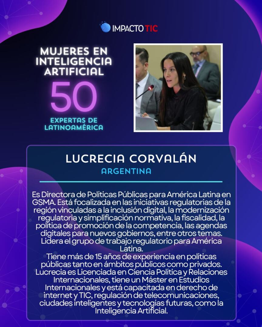 Tiene más de 15 años de experiencia en políticas públicas tanto en ámbitos públicos como privados. Lucrecia es Licenciada en Ciencia Política y Relaciones Internacionales, tiene un Máster en Estudios Internacionales y está capacitada en derecho de Internet y TIC, regulación de telecomunicaciones, ciudades inteligentes y tecnologías futuras, como la Inteligencia Artificial.