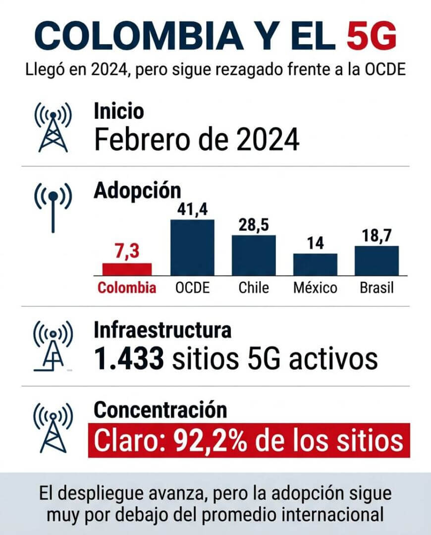El 5G llegó en febrero de 2024, con la asignación de licencias de espectro de 20 años en la banda de 3,5 GHz. Sin embargo, con apenas 7,3 suscripciones por cada 100 habitantes, Colombia está muy lejos del promedio OCDE de 41,4 y detrás de Chile (28,5), México (14) y Brasil (18,7). Claro concentra el 92,2 % de los 1.433 sitios 5G activos al cierre de 2024.