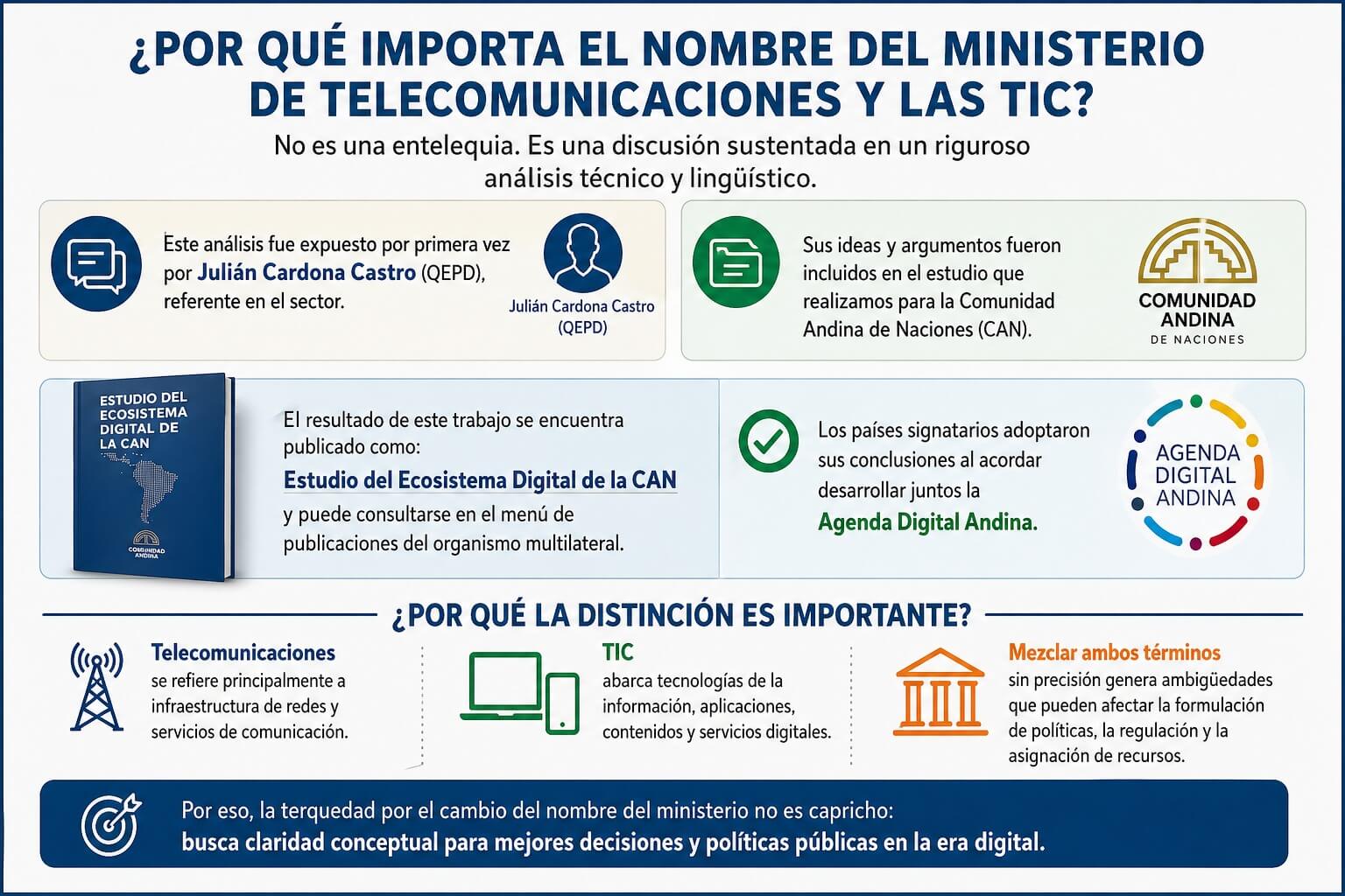 Me cuesta mucho denominar así al ministerio del sector, pero que le voy a hacer, así se llama aún. Insisto, esa terquedad por el cambio del nombre del ministerio del sector de las telecomunicaciones y las TIC, no es una entelequia. Está sustentada en un riguroso análisis técnico y lingüístico que le oí por primera vez a Julián Cardona Castro (QEPD) y que incluimos en el estudio que hicimos para la Comunidad Andina de Naciones y cuyos países signatarios adoptaron al acordar desarrollar juntos la Agenda Digital Andina y que pueden encontrar con el nombre de Estudio del Ecosistema Digital de la CAN en el menú de publicaciones del organismo multilateral.
