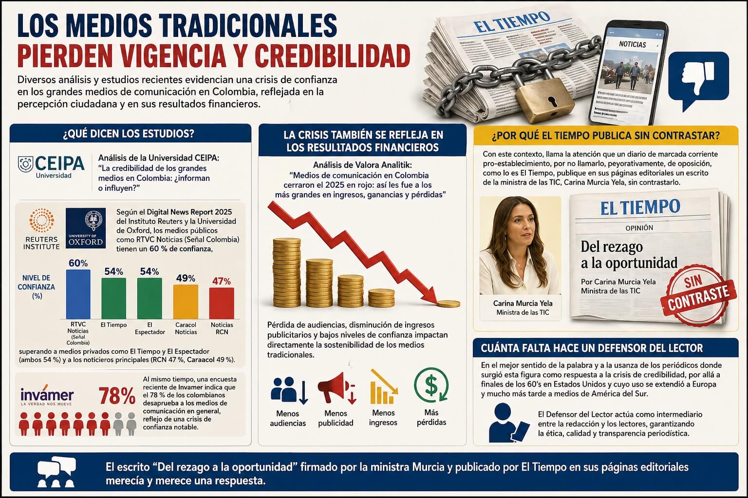 Los medios tradicionales están perdiendo vigencia y credibilidad como lo muestra un análisis de la universidad CEIPA con el título ‘La credibilidad de los grandes medios en Colombia: ¿informan o influyen?’ y que dice: “…Según el Digital News Report 2025 del Instituto Reuters y la Universidad de Oxford, los medios públicos como RTVC Noticias (Señal Colombia) tienen un 60 % de confianza, superando a medios privados como El Tiempo y El Espectador (ambos 54 %) y a los noticieros principales (RCN 47 %, Caracol 49 %). Al mismo tiempo, una encuesta reciente de Invamer indica que el 78 % de los colombianos desaprueba a los medios de comunicación en general, reflejo de una crisis de confianza notable”.