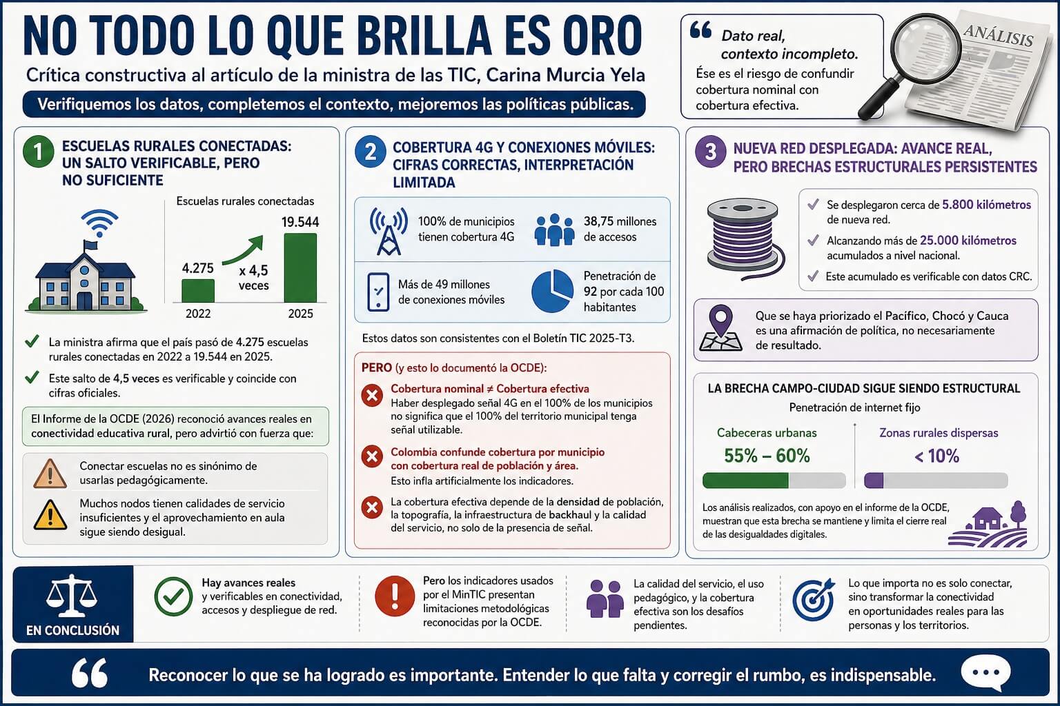 Esa frase de cajón o refrán popular nos sirve para enmarcar la crítica constructiva al artículo de marras. La ministra afirma que el país pasó de 4.275 escuelas rurales conectadas en 2022 a 19.544 en 2025. Este salto de 4,5 veces es verificable y coincide con cifras que he revisado y mencionado tangencialmente. El Informe de la OCDE de 2026 también reconoció avances reales en conectividad educativa rural, aunque señaló con fuerza que conectar escuelas no es sinónimo de usarlas pedagógicamente. La OCDE documentó que muchos de esos nodos tienen calidades de servicio insuficientes y que el aprovechamiento en aula sigue siendo desigual. Dato real, contexto incompleto.