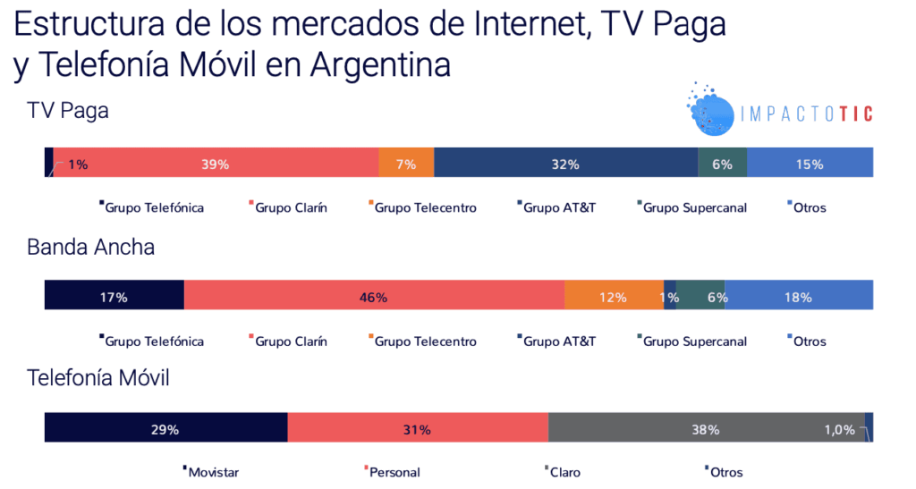 No obstante, de acuerdo con la Cámara Argentina de Internet, en el servicio de banda ancha fija se da un alto grado de concentración en la red del Grupo Clarín, propietario de Cablevisión-Fibertel-Personal, que llega al 46 % del mercado, 29 puntos porcentuales por encima del segundo competidor. Dominio que, a partir del proceso de convergencia, se ha trasladado a la TV por suscripción, un terreno en el que tiene el 39 %, 7 puntos arriba de DirecTV.