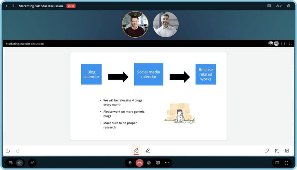 - La nueva versión de la herramienta también se integra con Zoho Projects para hacer seguimiento y gestionar tareas desde una misma interfaz, y con Zoho Notebook para ver y editar todas sus notas desde Cliq, o incluso para hacer notas rápidas mientras se encuentra en una junta. Finalmente, los calendarios de Zoho se pueden ver desde Cliq y agendar juntas desde allí.